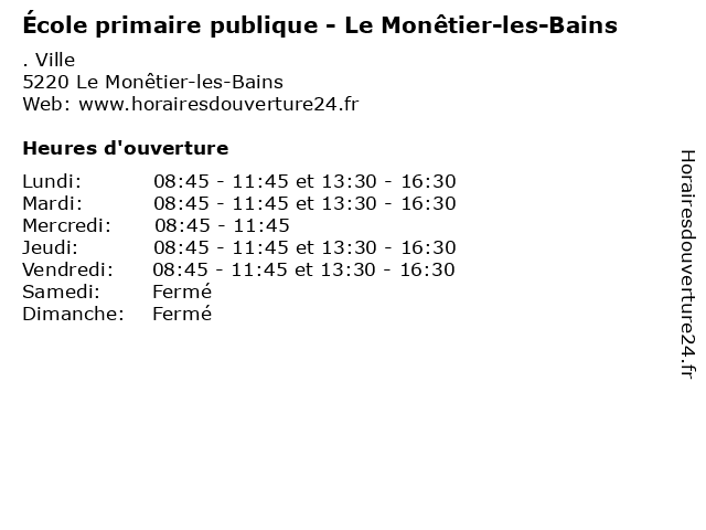 | Mardi | 08:45-11:45 et 13:30-16:30 |
