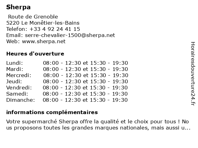 1 Supermarché Sherpa (Distance: 0,14 km) 4 Rue des Glaciers, 05220 Le Monêtier-les-Bains sherpa, supermarché 2 Sherpa (hiver) (Distance: 5,17 km) - Centre Commercial le Pré long, 05240 La Salle les Alpes fondue ou pierre à griller, hiver, la commande en ligne, le prêt d’appareils à raclette, marche, sherpa, supermarche 3 Sherpa (été ) (Distance: 7,76 km) - Le Serre d'Aigle, 05330 St Chaffrey fondue ou pierre à griller, la commande en ligne, le prêt d’appareils à raclette, marche, sherpa, supermarche, été 4 Sherpa (hiver) (Distance: 7,76 km) - Le Serre d'Aigle, 05330 St Chaffrey fondue ou pierre à griller, hiver, la commande en ligne, le prêt d’appareils à raclette, marche, sherpa, supermarche 5 Sherpa (Du 10 juin au 10 septembre) (Distance: 11,05 km) - Aile froide, 05340 Pelvoux 10, au, du, fondue ou pierre à griller, juin, la commande en ligne, le prêt d’appareils à raclette, marche, septembre, sherpa, supermarche 6 Sherpa (En Juillet et en Août) (Distance: 11,05 km) - Aile froide, 05340 Pelvoux août, en, et, fondue ou pierre à griller, juillet, la commande en ligne, le prêt d’appareils à raclette, marche, sherpa, supermarche |