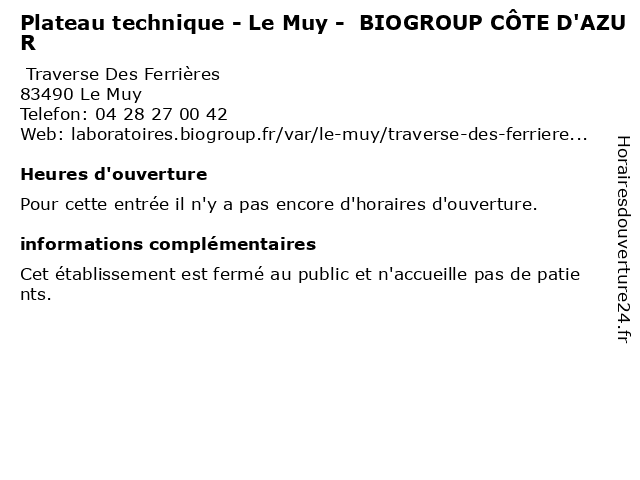 | Appeler Plateau technique - Le Muy - BIOGROUP CÔTE D'AZUR | |