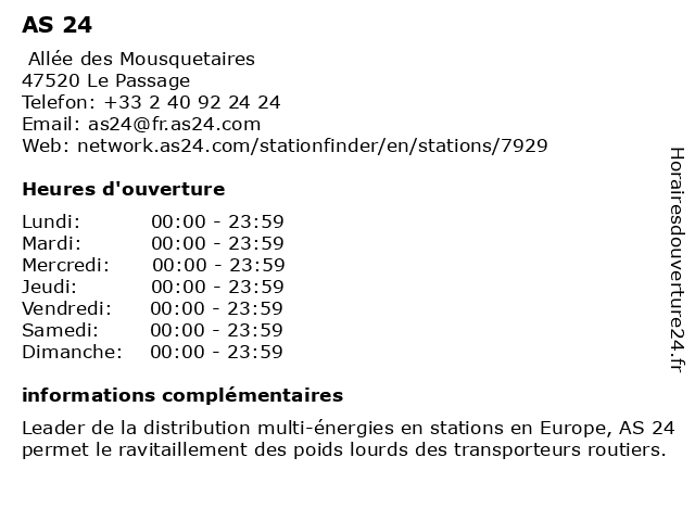 1 AS 24 (Distance: 0,00 km) Allée des Mousquetaires, 47520 Le Passage 24, ad blue, as, diesel, gas station for truck, gnr 2 AS 24 (Distance: 0,00 km) Allée des Mousquetaires, 47520 Le Passage 24, ad blue, as, diesel, gas station for truck, gnr 5 AS Autosécurité Contrôle Technique AGEN (Distance: 3,17 km) 50 Rue Rene Cassin, 47000 AGEN agen, as, autosécurité, contrôle, technique 6 AS 24 - Station-Service (Distance: 3,66 km) - Zone industrielle plaine, 47520 Le Passage 24, as, as24, carburant, de, distribution, les, lourd, poids, pour, professionnels, service, station |