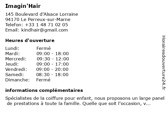 1 My Hair Coiffure (Distance: 1,65 km) 9bis avenue Ledru Rollin, 94170 Le Perreux-sur-Marne balayage, brushing, coiffeur, coiffure, coloration, coupe, hair, my 2 Mod's hair (Distance: 2,07 km) 74 rue charles de gaulles, 94360 Bry sur marne cheveux, coiffeur, hair, mod's 3 A l'Hair Libre (Distance: 3,76 km) 137 Rue Defrance, 94300 Vincennes beauté, coiffure, coiffures, coloristes, l'hair, libre 4 Eden Hair (Distance: 4,31 km) 7bis place du Général de Gaulle, 93340 Le Raincy balayage, brushing, coiffeur, coiffure, coloration, coupe, eden, hair 5 Tête en L'Hair (Distance: 4,39 km) 9 route de Gournay, 93160 Noisy-le-Grand balayage, coiffeur, coiffure, coloration, coupe, en, l'hair, mèche, tête 6 Hair and Sun (Distance: 7,18 km) 85 Route de Provins, 94436 Chennevieres sur Marne and, beaute, cafe, chaussures, enfants, hair, lingerie, mode femmes, mode hommes, restaurant, sport, sun |
