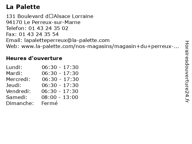 1 La Palette (Distance: 4,91 km) 16 bis boulevard Maréchal Leclerc, 94340 Joinville le Pont distributeur, grossiste, la, palette, peinture 2 La Palette (Distance: 8,45 km) 290 rue de charenton, 75012 Paris distributeur, grossiste, la, palette, peinture 3 La Palette (Distance: 9,72 km) 20 Rue Charenton, 75012 Paris la, materiel, palette, revetement, services 4 La Palette (Distance: 14,01 km) 120 Avenue Gabriel Peri, 93400 Saint Ouen distributeur, grossiste, la, palette, peinture 5 La Palette (Distance: 14,23 km) 120 Avenue Gabriel Peri, 93400 Saint- Ouen enduit, fournitures, la, magasin, matériel, palette, peintures 6 La Palette (Distance: 15,50 km) 52 boulevard Jean Jaurès, 92110 Clichy distributeur, grossiste, la, palette, peinture |