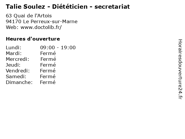 1 Nabila Meniri - Diététicien (Distance: 1,36 km) 188 Grande Rue Charles de Gaulle, 94130 Nogent-sur-Marne cabinet, diététicien, diététique, medical, meniri, nabila, secrétariat 2 Dr Aziza Abdelkader - Médecin généraliste - secretariat (Distance: 2,32 km) 161 Boulevard d'Alsace Lorraine,, 94170 Le Perreux-sur-Marne abdelkader, aziza, dr, généraliste, médecin, médecine, médical, pharmaceutique, secretariat, traitement 3 Laetitia Garibaldi - Diététicien (Distance: 2,36 km) 33 Rue Léon Menu, 94360 Bry-sur-Marne cabinet, diététicien, diététique, garibaldi, laetitia, medical, secrétariat 4 Laetitia Garibaldi - Diététicien (Distance: 2,36 km) 33 Rue Léon Menu, 94360 Bry-sur-Marne cabinet, diététicien, diététique, garibaldi, laetitia, medical, secrétariat 5 Dr Ciham El Asri - Cardiologue - secretariat (Distance: 2,42 km) 9 Avenue du Président Roosevelt, 94170 Le Perreux-sur-Marne asri, cardiologue, ciham, dr, el, médecin, médecine, médical, pharmaceutique, secretariat, traitement 6 Aurélie Bloch - Diététicien - secrétariat (Distance: 2,65 km) 3-5 Avenue Watteau, 94130 Nogent-sur-Marne aurélie, bloch, cabinet, diététicien, diététique, medical, secrétariat |