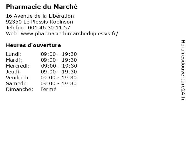 1 Pharmacie du Marché (Distance: 2,76 km) 70 Rue Boucicaut, 92260 Fontenay aux Roses du, herboristerie, marché, médicaments, paramédical, parapharmacie, pharmacie, pharmacien, santé, traitements 2 Pharmacie Du Marché (Distance: 4,31 km) 26 rue Auguste Mounié, 92160 Antony cosmétiques, du, marché, médicaments, pharmacie 3 Pharmacie du Marché (Distance: 6,50 km) 18 Rue Henri Thirard, 94240 L'Hay-les-Roses du, herboristerie, marché, médicaments, paramédical, parapharmacie, pharmacie, pharmacien, santé, traitements 4 Pharmacie du Marché (Distance: 6,77 km) 38-40 Boulevard Brune, 75014 Paris du, marche, marché, médicaments, pharmacie, santé, service 5 Pharmacie du Marché (Distance: 12,18 km) 41 avenue François Mitterrand, 91200 Athis-Mons du, herboristerie, homéopathie, location / vente appareils médicaux., marché, pharmacie, produits vétérinaires 6 Pharmacie du Marché (Distance: 13,31 km) 4 Rue Louis Jacques Mezard, 91600 Savigny sur Orge du, herboristerie, marché, médicaments, paramédical, parapharmacie, pharmacie, pharmacien, santé, traitements |