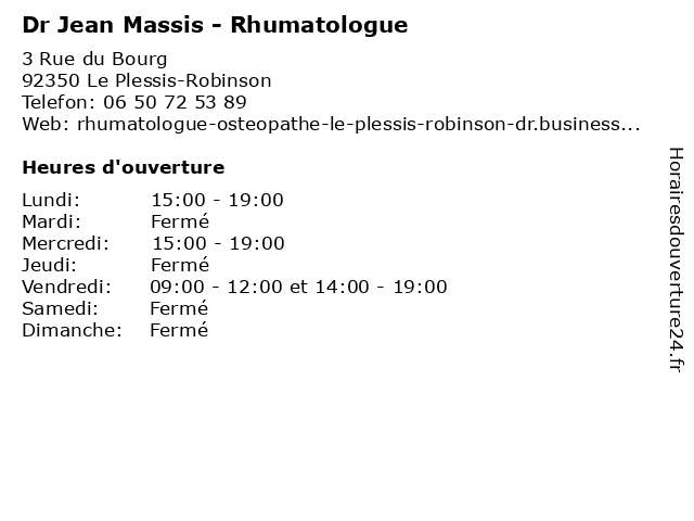 1 Dr Jean Massis - Rhumatologue (Distance: 4,72 km) 10 Rue Minard, 92130 Issy-les-Moulineaux consultation, docteur, dr, jean, massis, med, médecin, médecine, rhumatologue, secrétariat, traitement 2 Dr Jean Massis - Rhumatologue (Distance: 7,30 km) 37 Rue des Volontaires, 75015 Paris dr, jean, massis, médecin, médecine, médical, pharmaceutique, rhumatologue, traitement 3 Dr Jean Massis - Rhumatologue (Distance: 7,30 km) 37 Rue des Volontaires, 75015 Paris dr, jean, massis, médecin, médecine, médical, pharmaceutique, rhumatologue, traitement 4 Dr Jean Massis - Rhumatologue - secrétariat (Distance: 0,31 km) 1 Villa des Camélias, 92350 Le Plessis-Robinson consultation, docteur, dr, jean, massis, med, médecin, médecine, rhumatologue, secrétariat, traitement 5 Dr Françoise Massis - Dermatologue et vénérologue (Distance: 2,27 km) 3 Avenue de Villacoublay, 92360 Meudon dermatologue, docteur, dr, et, françoise, massis, vénérologue 6 Pompes Funèbres Massis - Clamart (Distance: 3,35 km) 91 Avenue Henri Barbusse, 92140 Clamart clamart, funèbres, massis, pompes |