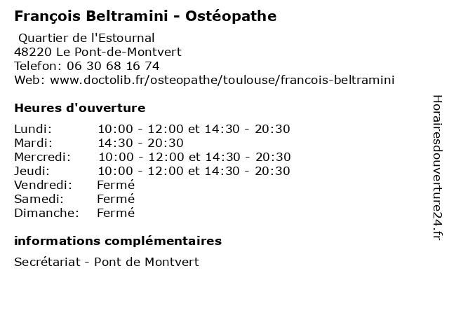| Lundi | 10:00-12:00 et 14:30-20:30 |