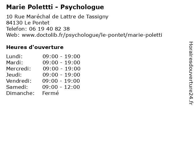 1 École Primaire Publique Marie Curie (Distance: 0,23 km) 23 Avenue Gustave Goutarel, 84130 Le Pontet cours, curie, education, marie, primaire, publique, services, École, école 2 Marie Poletti - Psychologue (Distance: 0,25 km) 1 avenue Charles de Gaulle, 84130 Le Pontet marie, medecin, poletti, psycho, psychologue, psychomotricienne, sante 3 Jaffuel Marie Restauration (Distance: 0,36 km) La Graviere, 84130 Le Pontet jaffuel, marie, restaurants, restauration 4 Chicken Folie' s (Distance: 1,11 km) 64 Rue Jean et René Reinaudo, 84130 Le Pontet boissons, chicken, collations, folie, folie', restaurants 5 Najwa Sadki - Psychologue (Distance: 1,67 km) 1420 Route de Realpanier, 84130 Le Pontet najwa, psy, psychiatre, psychologue, sadki, sante, soins 6 Fernanda Alves - Psychologue (Distance: 2,12 km) 314 Rue René Cassin, 84000 Avignon alves, fernanda, folie, psychiatre, psychiatrie, psychiatrique, psychologue |
