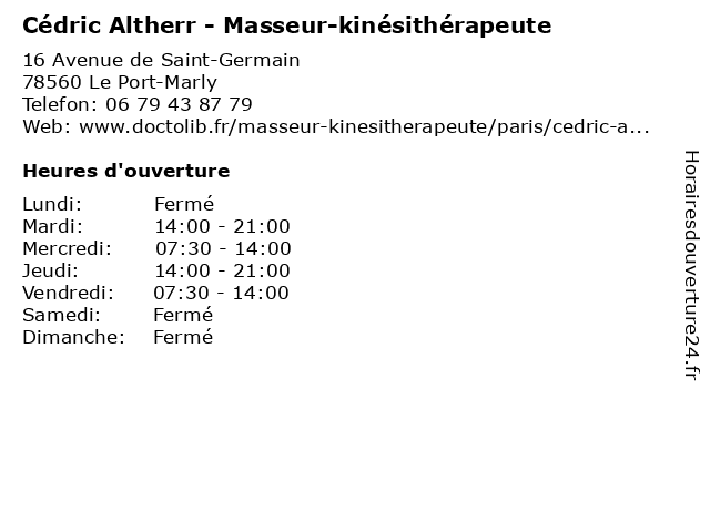 1 Cédric Altherr - Masseur-kinésithérapeute (Distance: 0,60 km) 16 Avenue de Saint-Germain, 78560 Le Port-Marly altherr, cabinet, consultation, cédric, docteur, kinésithérapeute, masseur, médecins, médical, santé, secrétariat 2 Cédric Altherr - Masseur-kinésithérapeute (Distance: 0,60 km) 16 Avenue de Saint-Germain, 78560 Le Port-Marly altherr, at, cédric, kinésithérapeute, massages, masseur, mobilite, secrétari, secrétariat 3 Cédric Altherr - Masseur-kinésithérapeute (Distance: 12,18 km) 1 Allée Claude Monet, 92300 Levallois-Perret altherr, cédric, kiné, kinésithérapeute, masseur, rééducation, soin 4 Cédric Bouchareinc - Ostéopathe (Distance: 6,76 km) 4 Allée du Roy, 78150 Le Chesnay actes et symptômes, bouchareinc, cédric, expertises, ostéopathe, ostéopathie, ostéopathie de la femme enceinte 5 Maître Cédric Devouges - Avocat (Distance: 10,59 km) 1-2 Place des Saisons, 92400 Courbevoie avocat, avocate, avocats, civils, cédric, devouges, droits, juridiques, maître 6 Dr Cédric Kron - Chirurgien plasticien et esthétique (Distance: 12,69 km) 21 rue de Rémusat, 75016 Paris chirurgien, consultation, cédric, docteur, dr, esthétique, et, kron, med, médecin, médecine, plasticien, traitement |