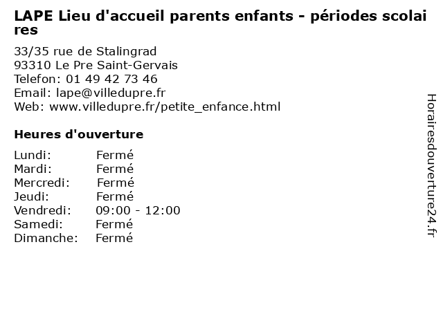 1 LAPE Lieu d'accueil parents enfants - périodes scolaires (Distance: 0,78 km) 21/23 rue Jules-Jaquemin, 93310 Le Pre Saint-Gervais d'accueil, de parole, enfants, et d'échanges, lape, lieu, lieu d'accueil parents enfants, lieu d'écoute, parents, périodes, scolaires 2 Lieu d'Accueil Jeunes - (18/25 ans) (Distance: 0,41 km) 53 rue André-Joineau, 93310 Le Pre Saint-Gervais 18/25, ans, d'accueil, jeunes, lieu, loisirs, pratiques artistiques, vacances 3 Crèche Multi-Accueil Les Poulains (Distance: 0,47 km) 13 rue Hoche, 93500 Pantin accueil, crèche, crèches, les, multi, poulains, services, services à la personne 4 Mon-enfant.fr - Accueil régulier (Distance: 0,51 km) 8 Rue Emile Augier, 93310 Le Pre St Gervais accueil, caregivers houses, child care, enfant.fr, family home, home care, kindergartens, micro-nurseries, mon, parental home, régulier 5 Association L’ENVOL pour les enfants européens (Distance: 0,52 km) 216 avenue Jean Jaurès, 75927 Paris association, enfants, européens, les, l’envol, malades, pour, programmes, récréatifs, séjours 6 Les Samedis en Famille - Lieu d'accueil enfants-parents (Distance: 0,57 km) 9 Sente des Dorées, 75019 Paris d'accueil, en, enfants, famille, jardin d'enfants, les, lieu, maison, parents, samedis, soins |