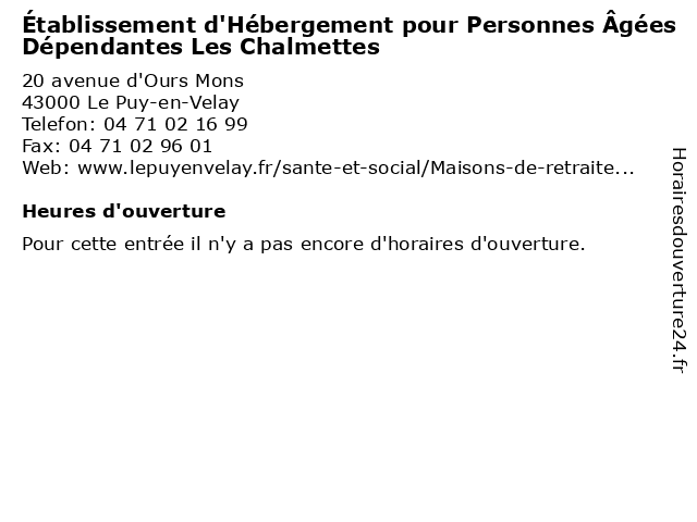 | Appeler Établissement d'Hébergement pour Personnes Âgées Dépendantes Les Chalmettes | |