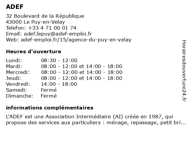 2 Adef Emploi (Distance: 48,24 km) 27 rue Sébastopol, 43100 Brioude adef, agence, aide, emploi, insertion, intérim, partiel, temporaire |