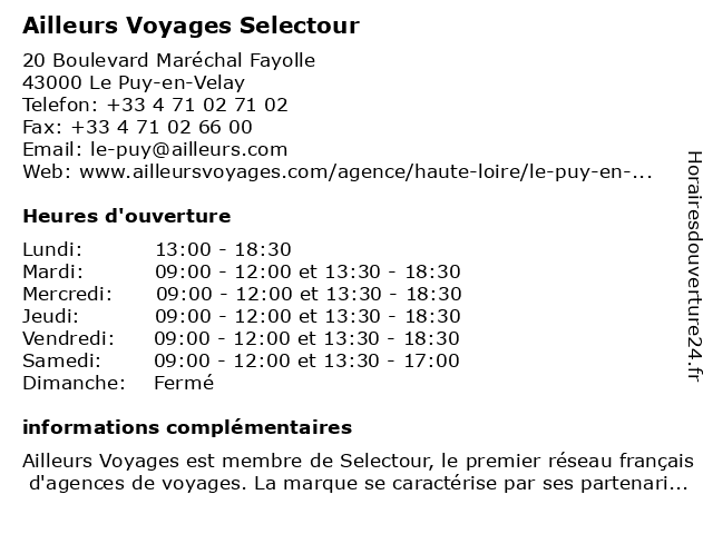 1 Havas Agence de Voyages Migratour Franchisé indépendant (Distance: 0,01 km) 5 Avenue Georges Clemenceau, 43000 Le Puy-en-Velay agence, de, franchisé, havas, indépendant, migratour, voyages 2 Havas Voyages (Distance: 0,05 km) 5 Avenue Georges Clémenceau, 43000 Le-Puy-en-Velay agence, havas, services, voyages 3 Un Jour Ailleurs (Distance: 0,39 km) 15 Rue St Gilles, 43000 Le Puy en Velay accessoires, ailleurs, jour, mode, un, vetements 4 E.Leclerc Voyages (Distance: 2,19 km) 131 avenue Charles Dupuy, 43700 Brives Charensac agence, book, e.leclerc, hôtels, réservations, tourisme, vacances, voyages 6 |