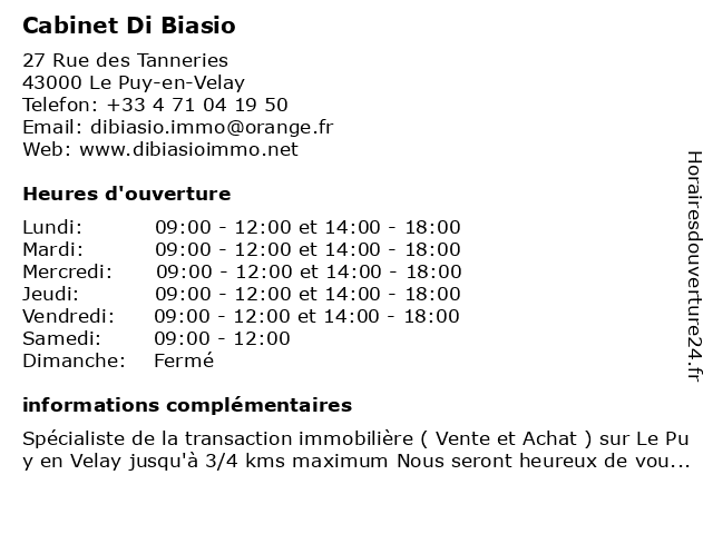 1 Cabinet d'Ophtalmologie du Dr Girard - Ophtalmologie (secrétariat ) (Distance: 0,19 km) 1 Place Michelet, 43000 Le Puy en Velay cabinet, consultation, d'ophtalmologie, docteur, dr, du, girard, ophtalmologie, santé, secrétariat 2 Cabinet Novances (Distance: 0,38 km) 28 place du Breuil, 43000 Le Puy-en-Velay cabinet, comptable, conseil, fiscalité, formation, juridique, novances, social, solution digitale 3 Coiffure Thierry DI Biasio (Distance: 0,40 km) 10 Avenue Clément Charbonnier, 43000 Le Puy-en Velay barbier, biasio, coiffure, di, mixte, salon, thierry 4 Cabinet médical du docteur Giot - Médecine générale (secrétariat ) (Distance: 0,44 km) 13 Place du Breuil, 43000 Le Puy en Velay cabinet, consultation, docteur, du, giot, générale, médecine, médical, santé, secrétariat 5 OPE Haute Loire - Cabinet (Distance: 0,51 km) 23 avenue Charles Dupuy, 43000 Le Puy-en-Velay assurance, auto, automobile, avignon, cabinet, collision, conseil, du, expertise, haute, idea, loire, ope, ouverture 6 Cabinet de Recrutement de Haute-Loire (Distance: 0,61 km) 38 Rue du Faubourg Saint Jean, 43000 Le Puy-en-Velay agence de recrutement, agence intérim, agence pour l'emploi, cabinet, cabinet de recrutement, cdi, de, haute, intérim, loire, recrutement |