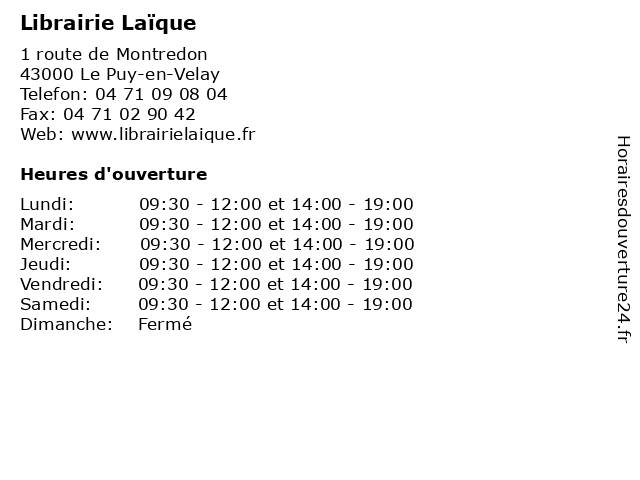 | Vendredi | 09:30-12:00 et 14:00-19:00 |