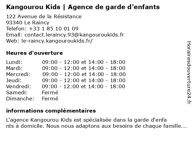 1 Kangourou Kids | Agence de garde d'enfants (Distance: 6,90 km) 53 Avenue Pasteur, 93100 Montreuil agence, babysitter, babysitting, d'enfants, de, garde, garde enfant, garde enfant a domicile, kangourou, kids, nounou, sortie ecole 2 Kangourou Kids | Agence de garde d'enfants (Distance: 7,26 km) Rue de l'Université, 93160 Noisy-le-Grand agence, babysitter, babysitting, d'enfants, de, garde, garde enfant, garde enfant a domicile, kangourou, kids, nounou, sortie ecole 3 Kangourou Kids | Agence de garde d'enfants (Distance: 7,96 km) 8 Rue Charles Pathé, 94300 Vincennes agence, babysitter, babysitting, d'enfants, de, garde, garde enfant, garde enfant a domicile, kangourou, kids, nounou, sortie ecole 4 Kangourou Kids | Agence de garde d'enfants (Distance: 11,63 km) 79 Avenue du Bac, 94210 Saint-Maur-des-Fossés agence, babysitter, babysitting, d'enfants, de, garde, garde enfant, garde enfant a domicile, kangourou, kids, nounou, sortie ecole 5 Kangourou Kids | Agence de garde d'enfants (Distance: 12,05 km) 22 Rue Pierre Mendès France, 77200 Torcy agence, baby-sitter, baby-sitting, d'enfants, de, garde, garde enfants, garde enfants à domicile, kangourou, kids, nounou, sortie école 6 Kangourou Kids | Agence de garde d'enfants (Distance: 12,69 km) 6 Rue Riboutté, 75009 Paris agence, babysitter, babysitting, d'enfants, de, garde, garde enfant, garde enfant a domicile, kangourou, kids, nounou, sortie ecole |