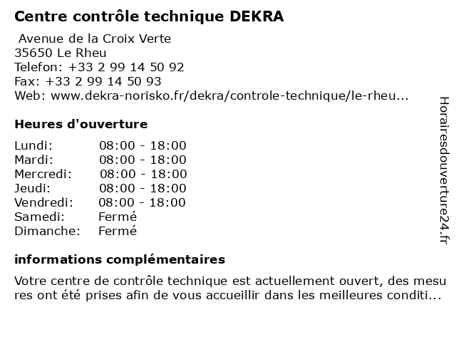 Description de l'entreprise :Préparer votre contrôle techniquePour préparer votre contrôle technique dans notre centre DEKRA de Le Rheu, vous pouvez vérifier en amont différents points comme les pneumatiques, la visibilité, le niveau d'huile ou encore l'habitacle. Pour tout savoir, consultez notre vidéo. Voir l'offre |