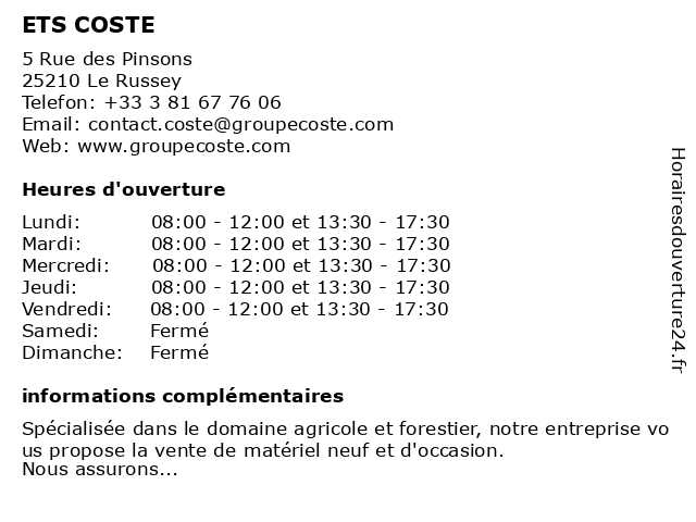 2 Jean-Claude Borne ETS (Distance: 8,49 km) 25 bis Rue du Capitaine Treilhes, 25140 Frambouhans borne, claude, ets, jean 3 Ets Chays (Distance: 29,39 km) 4 Grande rue, 25800 Valdahon chays, concessionnaire de remorques, ets, fournisseur de matériel agricole, magasin de vêtements de travail, réparation de tondeuses à gazon, vente de tondeuses à gazon, équipements pour pelouse et jardin 5 Prétot Frères Ets (Distance: 48,40 km) 5 Rue du Champ Chirey, 70230 Larians-et-Munans ets, frères, prétot 6 Etablissements Beauseigneur (Distance: 48,77 km) 6 Rue André Viellard, 90140 Froidefontaine beauseigneur, distribution, etablissements, ets, négoce, produits chimiques, sas, stockage |