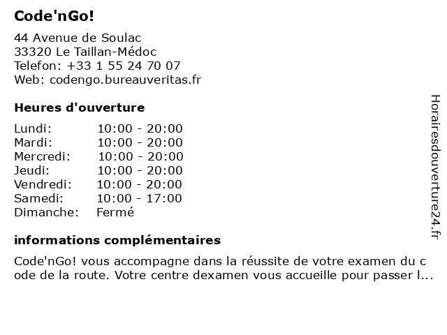 3 ObjectifCode - Centre d'examen du code de la route Saint-Aubin-de-Médoc (Distance: 4,49 km) 1 Allée D'euromedoc, 33160 Saint-Aubin-de-Medoc aubin, centre, code, d'examen, de, du, la, médoc, objectifcode, route, saint 4 Dr David Ngo - Médecin généraliste (Distance: 6,21 km) 8 Rue Pierre Georges Latécoère, 33700 Mérignac david, docteur, dr, generaliste, généraliste, medical, médecin, ngo, soin 5 ObjectifCode - Centre d'examen du code de la route Bordeaux (Distance: 8,16 km) 100 Cours De Quebec, 33000 Bordeaux bordeaux, centre, code, d'examen, de, du, la, objectifcode, route 6 Code'nGO - Centre d’Examen (Distance: 8,19 km) 9 avenue Pythagore, 33700 Mérignac centre, code, code'ngo, d’examen, examens, permis |