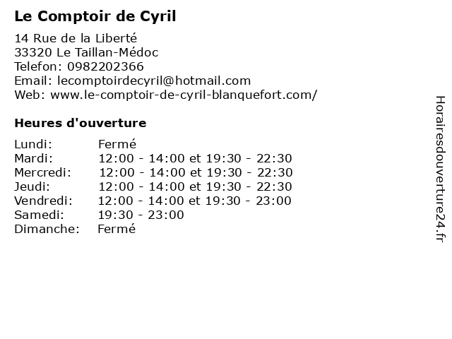 | Mardi | 12:00-14:00 et 19:30-22:30 |