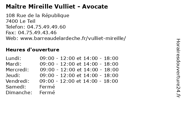 1 Maître Mireille Couston - Avocate (Distance: 9,17 km) 525 chemin du Marais, 26740 Savasse avocate, avocats, civils, couston, droits, juridiques, maître, mireille 2 Dr Mireille Vialle - Médecin généraliste (Distance: 19,49 km) 462 Avenue Marc Séguin, 07000 Privas consultation, docteur, dr, généraliste, med, mireille, médecin, traitement, vialle 3 Mireille Mahe - Sage-femme (Distance: 23,59 km) 14 avenue de Bellande, 07200 Aubenas consultation, docteur, dr, femme, mahe, med, mireille, médecin, sage, traitement 4 Chez Mireille (Distance: 28,20 km) 3 Rue Jean Jaurès, 07600 Vals-les-Bains chez, delepine, jean, marc, mireille, restaurants 5 DOMAINE MIREILLE et VINCENT (Distance: 30,54 km) 7 Avenue Mal Foch, 84600 Valréas domaine, et, mireille, vincent 6 Pizza Kebab Mimi (Distance: 34,66 km) Quartier De La Gare, 07120 Grospierres huot, kebab, mimi, mireille, pizza, restaurants, zimmermann |