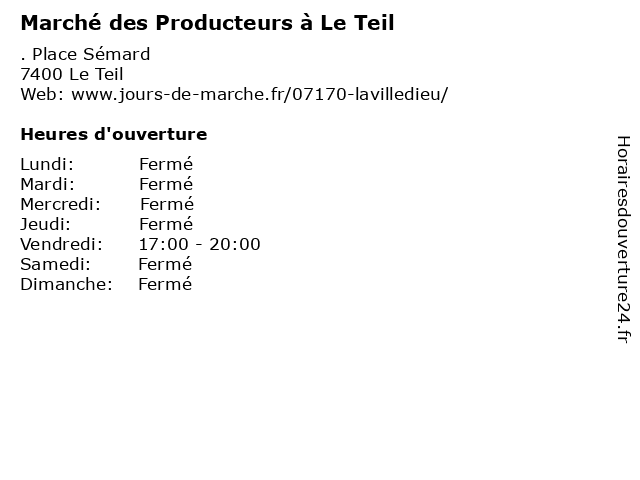 1 Marché à Le Teil (Distance: 0,00 km) . Place Sémard, 07400 Le Teil frutas, hortalizas, le, marché, mercado, teil, verduras 2 Marché à Montélimar (Distance: 4,94 km) . Place Saint-James, 26200 Montelimar frutas, hortalizas, marché, mercado, montélimar, verduras 3 Marché à Montélimar (Distance: 5,31 km) . Place Du Marche, 26200 Montelimar frutas, hortalizas, marché, mercado, montélimar, verduras 4 Marché à Ancône (Distance: 5,55 km) . Ville, 26200 Ancone ancône, frutas, hortalizas, marché, mercado, verduras 5 Marché à Sauzet (Distance: 5,55 km) . Ville, 26740 Sauzet frutas, hortalizas, marché, mercado, sauzet, verduras 6 Marché à Viviers (Distance: 7,58 km) . Place de La Roubine, 07220 Viviers frutas, hortalizas, marché, mercado, verduras, viviers |