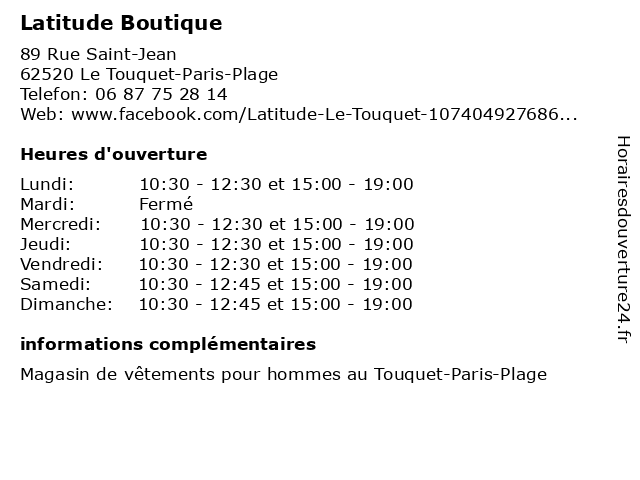 1 Boutique Je Craque Encore (Distance: 0,00 km) 76 Avenue Saint-Jean, 62520 Le Touquet-Paris-Plage accessoires, boutique, craque, encore, femme, je, mode, vêtements 2 Carat Boutique (Distance: 0,00 km) 16 Rue Saint-Jean, 62520 Le Touquet-Paris-Plage bijouterie, bijoux, boutique, carat, horlogerie, joaillerie 3 La Boutique de Mélanie (Distance: 0,09 km) 45 Rue de Moscou, 62520 Le Touquet boutique, de, décoration, la, meubles, mobilier, mélanie, objets 4 Boutique Arthur (Distance: 0,13 km) 62 Rue Saint Jean, 62520 Le Touquet accessoires, arthur, boutique, habillement, mode, pret à porter, vêtements 5 Mat's Boutique (Distance: 0,37 km) 14 Rue Saint Jean, 62520 Le Touquet-Paris-Plage accessoires, boutique, mat's, mode, vêtements 6 Boutique Cozy & Ycoz (Distance: 0,37 km) 3 avenue du Verger, 62520 Le Touquet-Paris-Plage accessoires, boutique, cozy, femme, homme, mode, vêtements, ycoz |