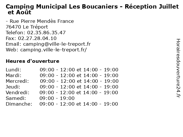 1 Camping Municipal Les Boucaniers - Réception Avril à Juin et Septembre (Distance: 0,00 km) - Rue Pierre Mendès France, 76470 Le Tréport avril, boucaniers, camping, en, et, juin, les, loisirs, mai, municipal, réception, septembre, tourisme, vacances 2 Camping Municipal Les Boucaniers - Réception Octobre à Mars (Distance: 0,00 km) - Rue Pierre Mendès France, 76470 Le Tréport boucaniers, camping, décembre, en, et, février, janvier, les, loisirs, mars, municipal, novembre, octobre, réception, tourisme, vacances 3 Bibliothèque - Juillet et Août (Distance: 2,53 km) . place de la Tolérance, 76260 Eu août, bibliothèque, cd audio, cd.rom, et, horaire, juillet, livres, revues 4 Camping Le Rompval - Réception Haute Saison (Distance: 2,83 km) 1 Route des Blengues, 80350 Mer-les-Bains camping, caravaning, haute, le, mobil home, rompval, réception, saison, séjour, tourisme, vacances 5 Camping La Berquerie - Juillet et Août (Distance: 9,71 km) - Route Départementale 1314, 76260 Le Mesnil-Réaume accueil, août, berquerie, camping, et, juil., juilet., juillet, la, loisirs, tourisme, vacances 6 Centre Aquatique Vimeo - Espace Aquatique (du 10 juillet au 06 août) (Distance: 12,03 km) - Avenue de la Libération, 80130 Friville-Escarbotin 06, 10, août, aqua, aquatique, au, centre, du, espace, juillet, piscine, vimeo |