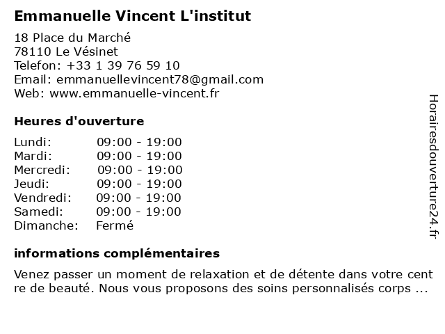 2 Institut de beauté Bodyminute (Distance: 0,19 km) 12 Rue Auber, 78110 Le Vésinet beauté, bodyminute, de, institut 3 Institut Jane Goodall France (Distance: 0,84 km) 58 route de la Plaine, 78110 Le Vesinet aide, association, biodiversité, durable, développement, france, goodall, institut, jane, protection 4 Vincent Tartier - Masseur-kinésithérapeute (Distance: 1,04 km) 64 Avenue de la Princesse, 78110 Le Vésinet kiné, kinésithérapeute, masseur, rééducation, soin, tartier, vincent 5 Maison NS Institut (Distance: 1,09 km) 67 Avenue de la Princesse, 78110 Le Vésinet institut, maison, ns 6 Institut Cassiopée (Distance: 1,30 km) 6 avenue de la Faisanderie, 78400 Chatou accompagnement, cassiopée, conflit, crise, institut, personne |