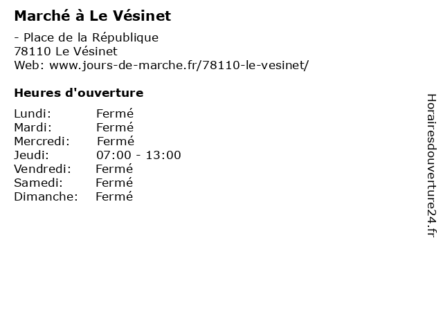 1 Marché à Le Vésinet (Distance: 1,38 km) - Place du Marché, 78110 Le Vésinet frutas, hortalizas, le, marché, mercado, verduras, vésinet 2 Marché à Le Vésinet (Distance: 1,60 km) - Place des Charmettes, 78110 Le Vésinet frutas, hortalizas, le, marché, mercado, verduras, vésinet 3 Marché République à Le Vésinet (Distance: 0,00 km) - Place de la république, 78110 Le Vésinet frutas, hortalizas, le, marché, mercado, république, verduras, vésinet 4 Marché à Bougival (Distance: 0,62 km) - Jean, 78380 Bougival bougival, frutas, hortalizas, marché, mercado, verduras 5 Marché à Chatou (Distance: 0,72 km) - Place Maurice Berteaux, 78400 Chatou chatou, frutas, hortalizas, marché, mercado, verduras 6 Marché à Chatou (Distance: 1,33 km) - Avenue Guy de Maupassant, 78400 Chatou chatou, frutas, hortalizas, marché, mercado, verduras |