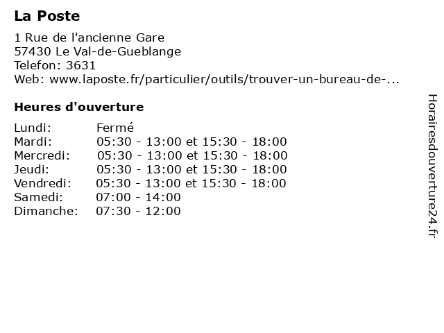 1 La Poste (Distance: 6,66 km) 45 Rue de la Libération, 67260 Keskastel agence, assurance, banque, banque postale, bureau de poste, chronopost, colis, courrier, dps, expéditions internationales, la, point, postale, poste, relais, timbres, téléphonie, ups, western union 2 La Poste (Distance: 7,70 km) 33 rue d'Altwiller, 67260 Harskirchen agence, assurance, banque, banque postale, bureau de poste, chronopost, colis, courrier, dps, expéditions internationales, la, point, postale, poste, relais, timbres, téléphonie, ups, western union 3 La Poste (Distance: 12,12 km) 1 Rue de Nancy, 57915 Woustviller agence, assurance, banque, banque postale, bureau de poste, chronopost, colis, courrier, dps, expéditions internationales, la, point, postale, poste, relais, timbres, téléphonie, ups, western union 4 La Poste (Distance: 12,56 km) 3 rue des Serpes, 57930 Mittersheim agence, assurance, banque, banque postale, bureau de poste, chronopost, colis, courrier, dps, expéditions internationales, la, point, postale, poste, relais, timbres, téléphonie, ups, western union 6 |