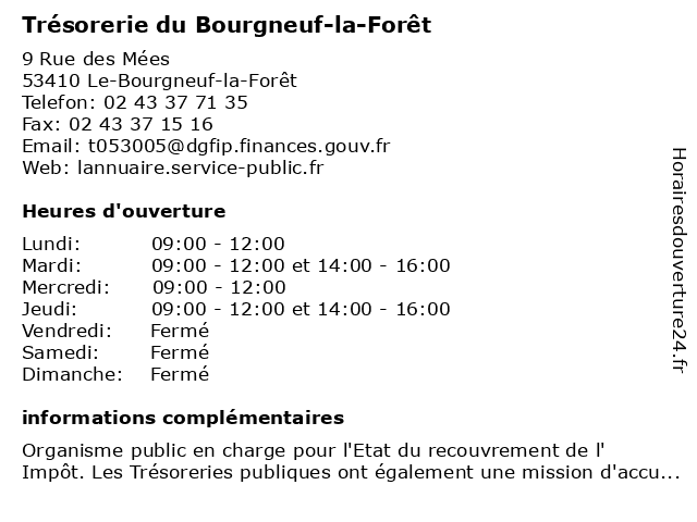 Termes de recherche pour Trésorerie du Bourgneuf-la-Forêt:la, du, foret, administration, finances, trésor, impôts, public, trésorerie, publiques, bourgneuf |