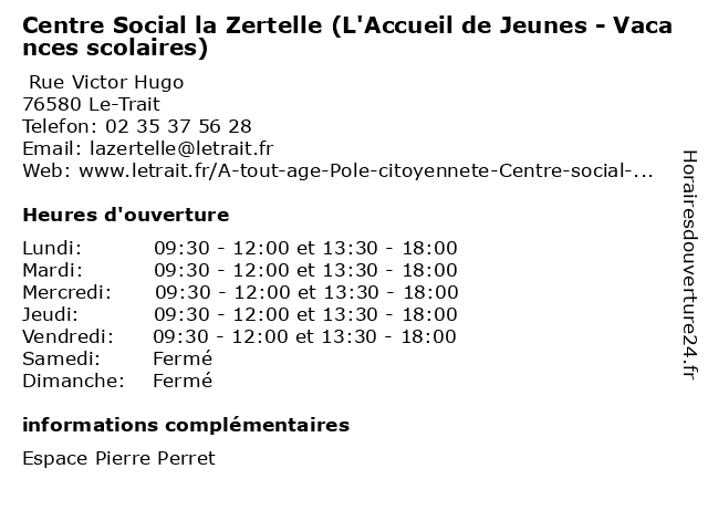 1 Centre Social la Zertelle (L'Accueil de Jeunes - Périodes scolaires) (Distance: 0,00 km) Rue Victor Hugo, 76580 Le Trait activités, centre, de, famille, jeunes, l'accueil, la, périodes, scolaires, social, zertelle 2 Institut du développement social- Accueil Service Admission (Distance: 16,03 km) . Allée de Flore, 76380 Canteleu accueil, admission, du, développement, enseignement, institut, laboratoire de recherche, service, social 3 Institut du développement social - Service Scolarité (Distance: 16,03 km) . Allée de Flore, 76380 Canteleu du, développement, enseignement, institut, laboratoire de recherche, scolarité, service, social 4 Institut du développement social - Coopérative (Distance: 16,03 km) . Allée de Flore, 76380 Canteleu coopérative, du, développement, enseignement, institut, laboratoire de recherche, social 5 Institut du développement social - Ceris (Distance: 16,03 km) . Allée de Flore, 76380 Canteleu ceris, du, développement, institut, promotion de la recherche, social, standard d'integrite 6 Institut du développement social - Pôle VAE (Distance: 16,03 km) . Allée de Flore, 76380 Canteleu du, développement, institut, pôle, reconnaissance savoirs experience professionnel, social, vae |