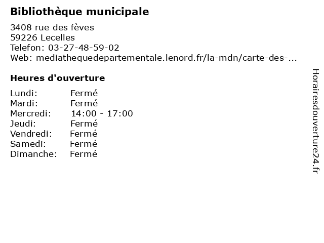 1 Bibliothèque municipale (Distance: 11,37 km) 1 rue du général de Gaulle, 59310 Aix-les-Orchies bibliothèque, cd audio, cd.rom, livres, municipale, revues 2 Bibliothèque municipale (Distance: 12,63 km) . rue Henri Parent, 59191 Helesmes bibliothèque, cd audio, cd.rom, livres, municipale, revues 3 Bibliothèque municipale (Distance: 12,96 km) 10 rue du Maréchal Foch, 59830 Bachy bibliothèque, cd audio, cd.rom, livres, municipale, revues 4 Bibliothèque municipale (Distance: 13,24 km) 1 rue Waldeck Rousseau, 59860 Bruay-sur-l'Escault bibliothèque, cd audio, cd.rom, livres, municipale, revues 5 Bibliothèque municipale (Distance: 13,56 km) . Place de la mairie, 59255 Haveluy bibliothèque, cd audio, cd.rom, livres, municipale, revues 6 Bibliothèque municipale (Distance: 13,97 km) 13 impasse Berthelot, 59163 Condé sur Escaut bibliothèque, cd audio, cd.rom, livres, municipale, revues |