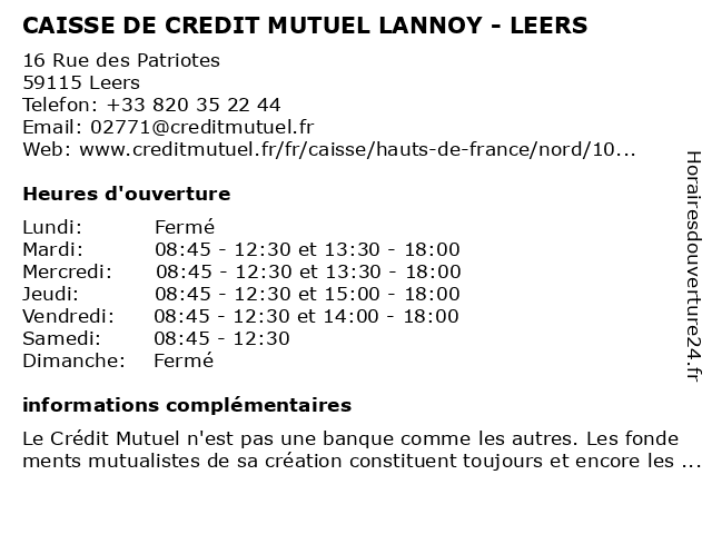 Termes de recherche pour CAISSE DE CREDIT MUTUEL LANNOY - LEERS:de, lannoy, crédit, mutuel, caisse, leers |