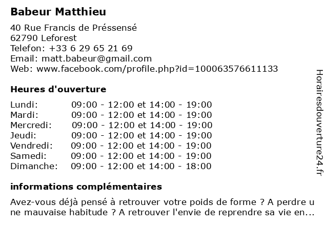 | Lundi | 09:00-12:00 et 14:00-19:00 |