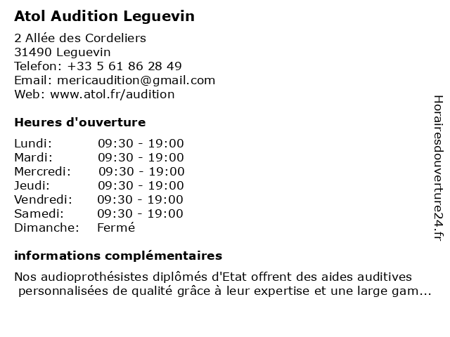 1 Atol Mon Opticien (Distance: 0,00 km) 2 Allée des Cordeliers, 31490 Léguevin atol, atol les opticiens, atol mon opticien, lentilles, lunettes de soleil, lunettes de vue, mon, opticien, opticien léguevin 2 Audition du Midi (Distance: 3,07 km) 10 bis Avenue des Pyrénées, 31880 La Salvetat-Saint-Gilles audition, du, midi 3 Pastel Audition SARL (Distance: 4,85 km) 6 Place Frédéric Bombail, 31830 Plaisance-du-Touch audition, pastel, sarl 4 Audition Bahuaud (Distance: 4,96 km) 69 Avenue des Pyrénées, 31830 Plaisance Du Touch aide, audioprothésiste, audition, auditive, bahuaud, conseil, santé, spécialiste 5 Audition Mutualiste - CENTRE COMMERCIAL LE COLIBRI (Distance: 7,52 km) 47 Boulevard Vincent Auriol,, 31170 Tournefeuille accessories, aids auditive, audition, centre, colibri, commercial, hear assessment, hearing aids, hearing protection, le, mutualiste 6 Audition Santé (Distance: 7,62 km) 1 route d’Aussonne, 31700 Cornebarrieu audioprothèse, audioprothésiste, audition, santé |