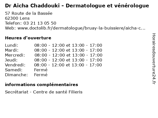 1 Dr Aicha Chaddouki - Dermatologue et vénérologue (Distance: 13,22 km) 59 Rue Pasteur, 62590 Oignies aicha, centre, chaddouki, de, dermatologue, docteur, dr, et, filieris, generaliste, medical, oignies, santé, soin, vénérologue 2 Dr Isabelle Desmarchelier - Dermatologue et vénérologue (Distance: 0,00 km) 57 Route de la Bassée, 62300 Lens consultation, dermatologue, desmarchelier, docteur, dr, et, isabelle, med, médecin, médecine, traitement, vénérologue 3 Dr Magali Drouard - Dermatologue et vénérologue (Distance: 0,00 km) 57 Route de la Bassée, 62300 Lens consultation, dermatologue, docteur, dr, drouard, et, magali, med, médecin, médecine, traitement, vénérologue 4 Dr Christine Vandembeuche - Dermatologue et vénérologue (Distance: 0,00 km) 57 Route de la Bassée, 62300 Lens christine, consultation, dermatologue, docteur, dr, et, med, médecin, médecine, traitement, vandembeuche, vénérologue 5 Dr Estelle Borne - Dermatologue et vénérologue (Distance: 6,23 km) - Place Jean Jaurès, 62160 Grenay borne, consultation, dermatologue, docteur, dr, estelle, et, med, médecin, médecine, traitement, vénérologue 6 Dr Julie de Labarthe - Dermatologue et vénérologue (Distance: 6,23 km) - Place Jean Jaurès, 62160 Grenay consultation, de, dermatologue, docteur, dr, et, julie, labarthe, med, médecin, médecine, traitement, vénérologue |