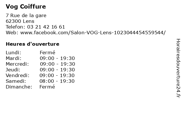 1 Vog Coiffure (Distance: 3,81 km) 145 Rue J.B Defernez, 62800 Lievin beauté, coiffeur, coiffure, salons de coiffure, vog 2 Vog Coiffure (Distance: 11,27 km) 65 Rue Edouard Plachez, 62220 Carvin beauté, coiffeur, coiffure, salons de coiffure, vog 3 Vog Coiffure (Distance: 15,80 km) 3 Rue Pasteur, 62000 Arras beauté, coiffeur, coiffure, salons de coiffure, vog 4 Indigo Coiffure (Distance: 0,14 km) 17 place de la République, 62300 Lens beauté, coiffeur, coiffure, indigo, lens, salon, soins 5 Isa Leignel Coiffure Beauté (Distance: 0,28 km) 4 Boulevard Emile Basly, 62300 Lens beauté, coiffeur, coiffure, coupe, isa, leignel, salon 6 Numéro 7 Coiffure (Distance: 0,29 km) 92 Rue René Lanoy, 62300 Lens beauté, brushing, coiffeur, coiffure, coupe, institut, lissage, numéro |