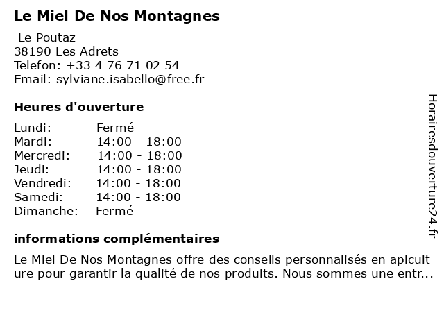 1 Abeille Dauphinoise (Distance: 20,95 km) 22 place Bernard Palissy, 38320 Poisat abeille, abeille dauphinoise, dauphinoise, ferme, miel 2 Marché des montagnes de l'Isère à Grenoble (Distance: 21,00 km) . Place aux herbes, 38000 Grenoble de, des, frutas, grenoble, hortalizas, l'isère, marché, mercado, montagnes, verduras 3 Lune De Miel By Just 1 Oui (Distance: 21,89 km) 32 Cours Berriat, 38000 Grenoble by, de, just, lune, miel, oui 4 Miellerie des Arves (Distance: 23,89 km) - Hameau La Tour, 73530 Saint-Jean d’Arves abeille, apiculture, arves, des, miel, miellerie, st-jean d’arves 5 O Rucher de Julie (Distance: 30,23 km) 1052 route de Champ Chabert, 38500 La Buisse bougie, cire, de, gelée, julie, miel, producteur, rucher 6 |