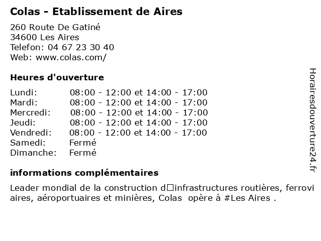 | Termes de recherche pour Colas - Etablissement de Aires:de, colas, aires, etablissement, entreprise générale de construction |