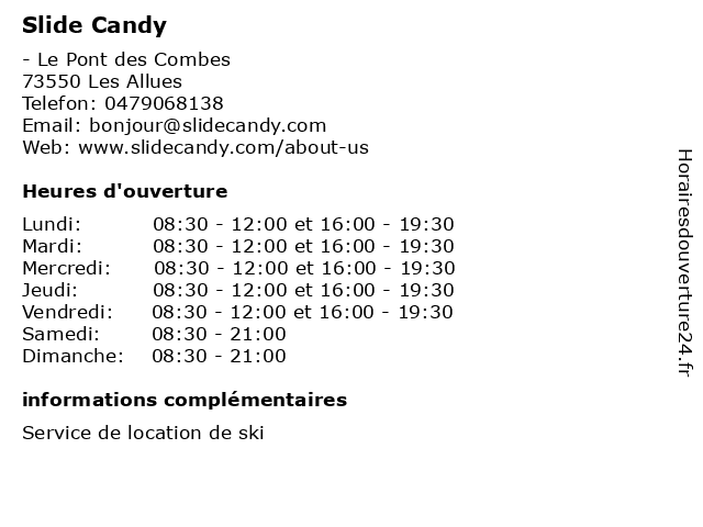 1 Slide Candy (Distance: 3,95 km) - Le Pont des Combes, 73550 Méribel candy, location, matériel, ski, slide, équipement 2 Ughetto Jean Joseph (Distance: 34,50 km) Vieux Village, 73150 Val D Isere cycles, jean, joseph, magasins, sport, ughetto 3 Chabert Jean-Marc (Distance: 34,81 km) 40 Allee Du Parc, 73460 Ste Helene Sur Isere chabert, cycles, jean, magasins, marc, sport 4 Candy & Co (Distance: 37,97 km) 2 Rue Claude Genoux, 73200 Albertville boisson, cadeaux, candy, co, confiserie, magasin 5 L.d.s. - Leclerc Distribution Sport (Distance: 38,02 km) 29 Rue De La Republique, 73200 Albertville cycles, distribution, leclerc, magasins, sport 6 Allevard Sportshop (Distance: 40,04 km) 10 Place de Verdun, 38580 Allevard allevard, cycles, réparation, sportshop, vente, vélo, vélos |