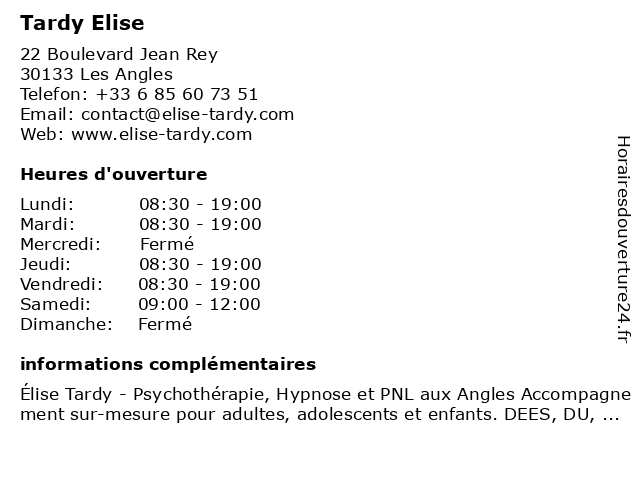 1 Maître Mélanie Letellier-Tardy - Avocate (Distance: 3,05 km) 10 rue du Roi René, 84000 Avignon avocat, avocate, droit, juridictionnelle, letellier, maître, mélanie, négociation, tardy 2 Elise Fontanille - Ostéopathe (Distance: 22,57 km) 77a Rond-Point de l'Amitié, 84200 Carpentras elise, fontanille, ostéo, ostéopathe, ostéopathes, soins 3 SCP Tardy & Dauzet - Huissiers de justice (Distance: 25,81 km) 14 Avenue Jean Perrin, 30200 Bagnols-sur-Cèze citoyen, dauzet, de, huissier, huissiers, justice, lois, scp, tardy 4 Elise Paoli - Ostéopathe (Distance: 32,89 km) 14 Impasse du Printemps, 30230 Bouillargues actes et symptômes, elise, expertises, médecin, ostéopathe, ostéopathie de la femme enceinte, paoli 5 Elise Méditerranée (Distance: 39,99 km) 94 avenue du dr Fleming, 30000 Nimes déchets, elise, entreprise, méditerranée, recyclage 6 La Crêperie de Salon (Distance: 43,78 km) 3 Rue de l'Horloge, 13300 Salon-de-Provence chevriere, creperie, crêperie, de, elise, henri, la, restaurants, salon |