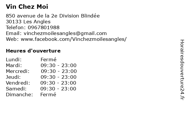 3 Chez Mimi (Distance: 1,20 km) 27 Avenue Jules Ferry, 30133 Les Angles boucheries, chez, mimi, poissonneries 4 Le Vin Devant Soi (Distance: 3,78 km) 4 Rue du Collège du Roure, 84000 Avignon boissons, cave, devant, le, magasins, soi, vin 6 Restaurant Chez Marie (Distance: 4,30 km) 4 Rue Louis Pasteur, 84000 Avignon bistrot, brasserie, chez, marie, restaurant, restauration |
