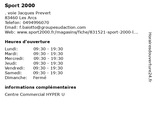 1 Sport 2000 (Distance: 0,10 km) 272 Centre Commercial Hyper U, 83460 Les Arcs 2000, accessoires, boutique, courses, montagne, pret à porter, sport, vêtements 2 Sport 2000 (Distance: 15,59 km) 272 Route nationale 7, 83600 Frejus 2000, accessoires, boutique, courses, montagne, pret à porter, sport, vêtements 3 Sport 2000 Montagne (Distance: 2,79 km) - Tournavelles, 73700 ARCS 2000, course à pied, mode, montagne, multisport, sport 4 Go sport (Distance: 5,37 km) , Immeuble les Gentianes, 05560 Vars accessoires, articles de sport, go, sport, vêtements de sport 5 CF7 Sport Nutrition (Distance: 16,53 km) 2 Chemin des Vernedes, 83480 Puget sur Argens cf7, coaching, cryolipolyse, electro, nutrition, perte, poids, pressothérapie, sport, sportive, stimulation 6 Casal Sport (Distance: 16,61 km) . Route des Vernedes, 83480 Puget-sur-Argens casal, marche, services, sport, sportifs |