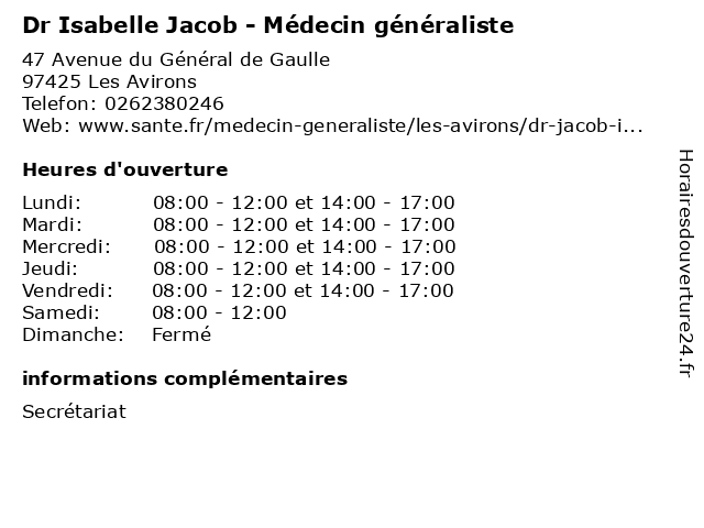 1 Dr Isabelle Teyssedre - Médecin généraliste (Distance: 9,02 km) 136 Rue du General Lambert, 97436 Saint-Leu consultation, docteur, dr, généraliste, isabelle, med, médecin, teyssedre, traitement 2 Cabinet Infirmier Isabelle Mussard (Distance: 15,32 km) 168 rue Gén de Gaulle, 97432 Saint pierre cabinet, infirmier, isabelle, mussard 3 Dr Juliette Lellouch - Médecin généraliste (Distance: 0,00 km) 47 avenue du Général De Gaulle, 97425 Les Avirons consultation, docteur, dr, généraliste, juliette, lellouch, med, médecin, traitement 4 Dr Nicolas Corbel - Médecin généraliste (Distance: 0,21 km) 60 avenue du Général De Gaulle, 97425 Les Avirons consultation, corbel, docteur, dr, généraliste, med, médecin, nicolas, traitement 5 Dr Marc Delahousse - Médecin généraliste (Distance: 0,23 km) 60 bis avenue du Général De Gaulle, 97425 Les Avirons consultation, delahousse, docteur, dr, généraliste, marc, med, médecin, traitement 6 Dr Eric Van-Leynseele - Médecin généraliste (Distance: 0,37 km) 70 Avenue du Général de Gaulle, 97425 Les Avirons consultation, docteur, dr, eric, généraliste, leynseele, med, médecin, traitement, van |
