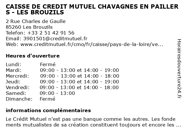 Termes de recherche pour CAISSE DE CREDIT MUTUEL CHAVAGNES EN PAILLERS - LES BROUZILS:en, les, de, crédit, mutuel, caisse, paillers, brouzils, chavagnes |