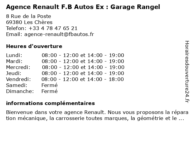 1 Renault - Borne de Recharge Electrique (Distance: 5,30 km) 397 Route de Lyon, 69480 Anse borne, de, electrique, recharge, renault, électrique 2 Renault Garage Dumont Buathier Agt (Distance: 5,30 km) 397 Route de Lyon, 69480 Anse agt, buathier, dumont, garage, renault 3 Garage Monnier Frères - Renault (Distance: 6,13 km) 105 Avenue des Frères Lumière, 69730 Genay automobile, concessionnaire, entretien, frères, garage, monnier, renault, réparation 4 RENAULT GARAGE BACONNIER (Distance: 6,61 km) 1078 Route de Lyon, 01600 Reyrieux baconnier, garage, renault 5 Auto Thivolle - Renault - Véhicules neuf et occasion (Distance: 10,05 km) 19 Avenue Edouard Herriot, 69400 Limas auto, automobile, concessionnaire, entretien, et, neuf, neuve, occasion, renault, réparation, thivolle, vente, véhicule, véhicules 6 Auto Thivolle - Renault minute (Distance: 10,06 km) 19 Avenue Edouard Herriot, 69400 Villefranche-sur-Saône auto, automobile, carrosserie, entretien, garage, minute, renault, réparation, thivolle, vidange |