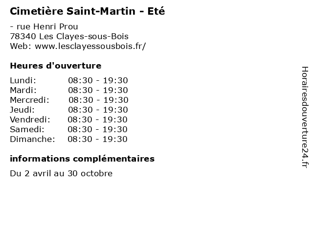 1 Cimetière Saint-Martin - Hiver (Distance: 0,00 km) - rue Henri Prou, 78340 Les Clayes-sous-Bois cercueil, cimetiere, cimetière, deuil, hiver, martin, mort, saint 2 Cimetière Henri Prou - Eté (Distance: 0,00 km) - rue Henri Prou, 78340 Les Clayes-sous-Bois cercueil, cimetiere, cimetière, deuil, eté, henri, mort, prou 3 Cimétière de la Broderie - Eté (Distance: 0,32 km) - Chemin de la Bretechelle, 78340 Les Clayes-sous-Bois broderie, cercueil, cimetiere, cimétière, de, deuil, eté, la, mort 4 Elise Martin-Reboud - Psychologue - secretariat (Distance: 1,11 km) 1 Place Ida Nudel, 78370 Plaisir elise, martin, médecin, médecine, médical, pharmaceutique, psychologue, reboud, secretariat, traitement 5 Centre Hospitalier Jean-Martin Charcot (secrétariat ) (Distance: 2,43 km) 3 Rue Marc Laurent, 78370 Plaisir centre, charcot, consultation, docteur, hospitalier, jean, martin, médecins, santé, secrétariat 6 Déchèterie (Eté) (Distance: 4,24 km) - Rue Jean Monnet, 78990 Élancourt bennes, déchèterie, eté, gravat, recyclage, tri |