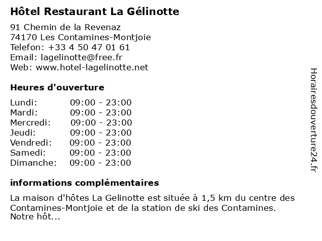 1 Chalet Hôtel Gai Soleil SARL (Distance: 0,98 km) 288 Chemin des Loyers, 74170 Les Contamines-Montjoie chalet, gai, hôtel, sarl, soleil 2 L'Etape - Chalet Hôtel (Distance: 1,80 km) 604 Route Des Moranches, 74170 Les Contamines-Montjoie alimentation, brasserie, chalet, hôtel, l'etape, parking, restaurant, terrasse 3 Chalet-Hôtel La Chemenaz (Distance: 1,84 km) 10 Allée de Nant Rouge, 74170 Les Contamines-Montjoie chalet, chemenaz, hôtel, la, mariage, restaurant, séminaire, tourisme 4 Boutique Hôtel La Féline Blanche (Distance: 5,14 km) 161 Route des Contamines, 74170 Saint-Gervais-les-Bains bar, blanche, boutique, féline, hotel, hôtel, la, restaurant, service 5 Citotel Liberty Mont Blanc Hôtel (Distance: 6,91 km) 734 Avenue du Mont d'Arbois, 74170 Saint-Gervais-les-Bains bar, blanc, citotel, hotel, hôtel, liberty, mont, restaurant, service 6 Hôtel La Ferme de Cupelin - Restaurant (Distance: 7,13 km) 198 route du Château, 74170 Saint-Gervais-les-Bains cuisine, cupelin, de, ferme, française, hôtel, la, restaurant, restauration, traditionnelle |