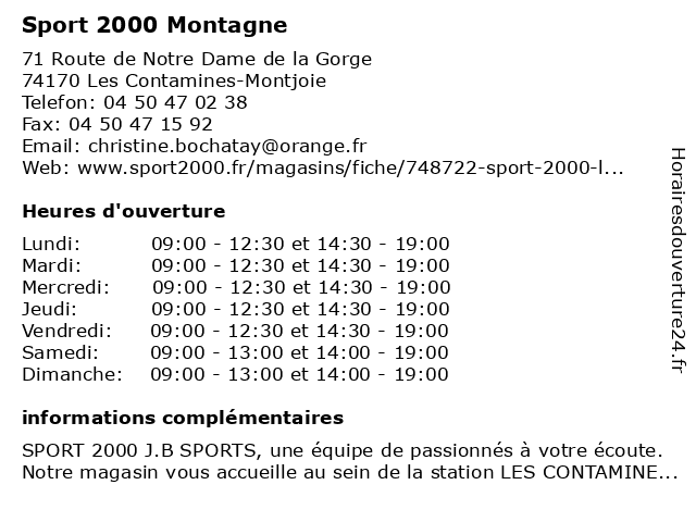 1 Sport 2000 Montagne (Distance: 7,84 km) 191 Avenue du Mont d'Arbois, 74170 Saint-Gervais-les-Bains 2000, course à pied, mode, montagne, multisport, sport 2 Sport 2000 Montagne (Distance: 8,91 km) - Place du telepherique de bellevue, 74310 Les Houches 2000, course à pied, mode, montagne, multisport, sport 3 Sport 2000 Montagne (Distance: 9,30 km) - Route de Rochebrune, 74120 Megève 2000, course à pied, mode, montagne, multisport, sport 4 Sport 2000 Montagne (Distance: 12,27 km) 121 Route Du Val D’Arly, 74120 Praz sur Arly 2000, course à pied, mode, montagne, multisport, sport 5 Sport 2000 Montagne (Distance: 16,13 km) 319 Rue Cachat le Geant, 74400 Chamonix 2000, course à pied, mode, montagne, multisport, sport 6 Sport 2000 Montagne (Distance: 16,36 km) 196 Avenue des Jeux Olympiques, 73620 Hauteluce 2000, course à pied, mode, montagne, multisport, sport |